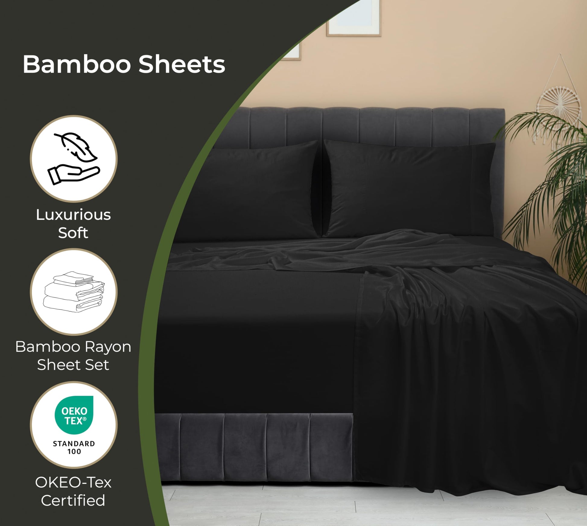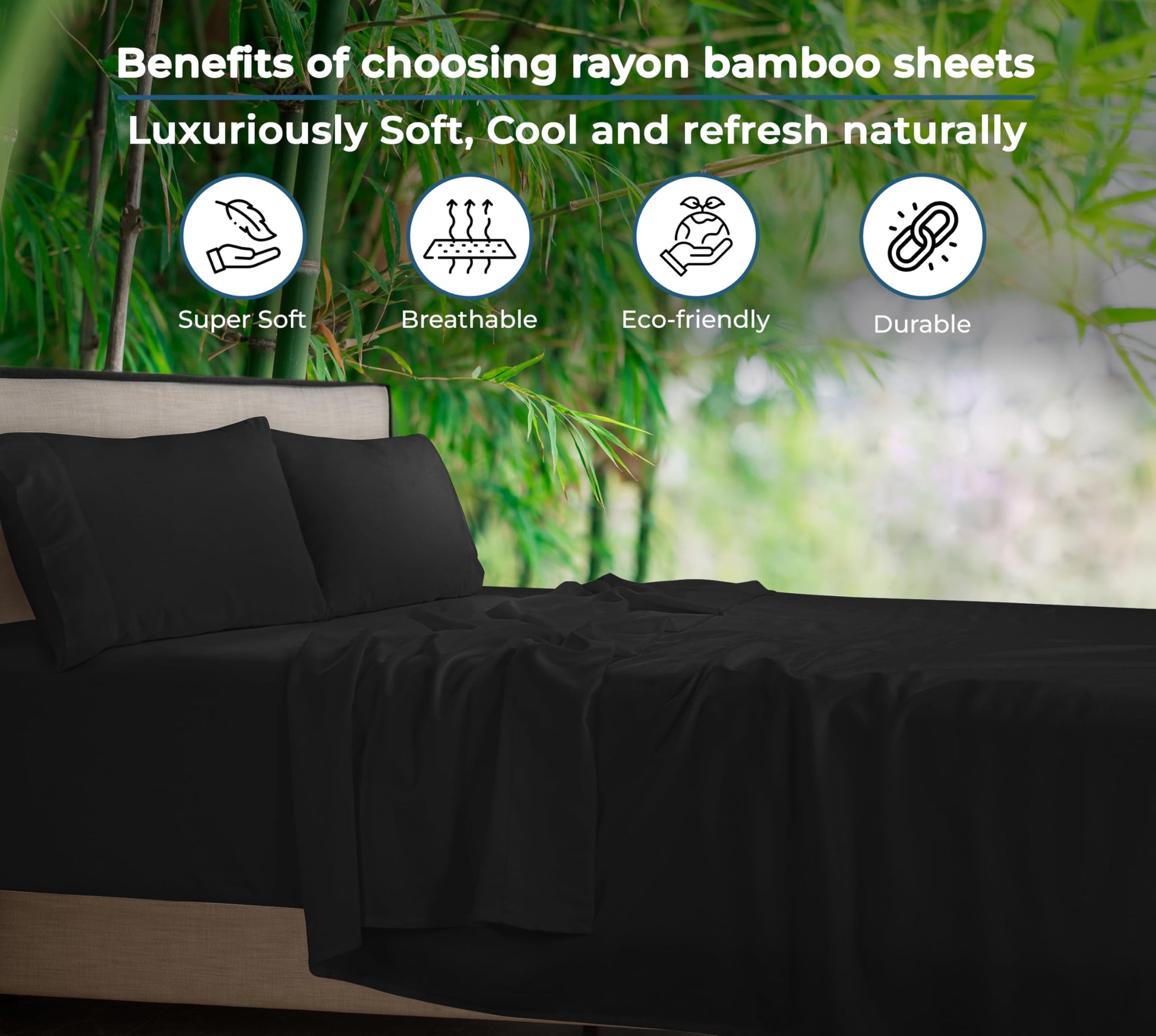 Royale Linen Bamboo Viscose Sheet Set - Cooling Bed Sheet Set - 1 Fitted, 1 Flat & 2 Pillowcase - Fits Up to 16" - Organic Viscose Derived from Bamboo - Bedding Sheet & Pillowcase (Black)