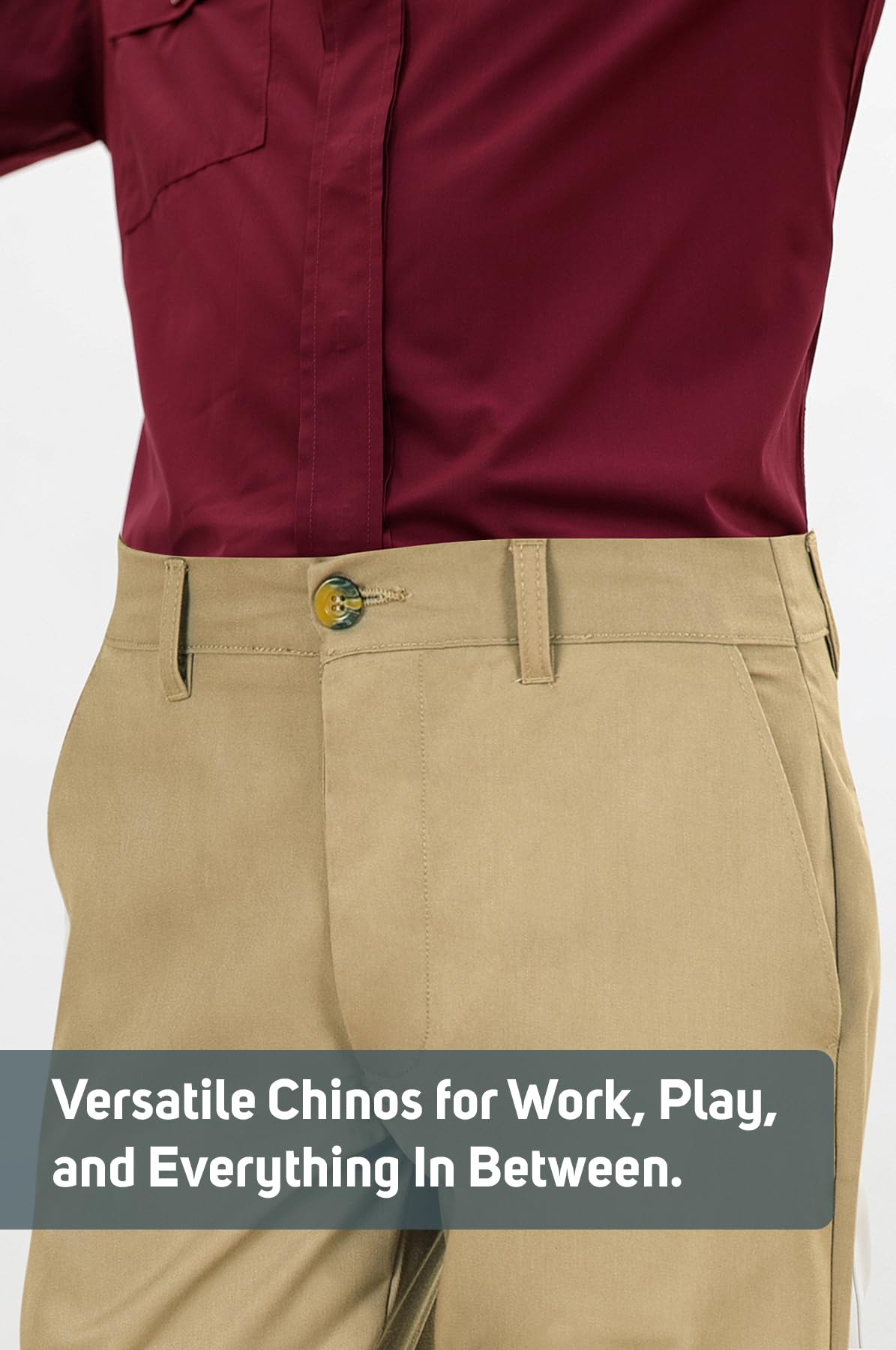 CLASSIC FIT: Flat-front chino pant is sure to be comfortable and functional for everyday wear. From the outdoors to work. Roomy through hip & thigh with straight leg. Sits at the waist