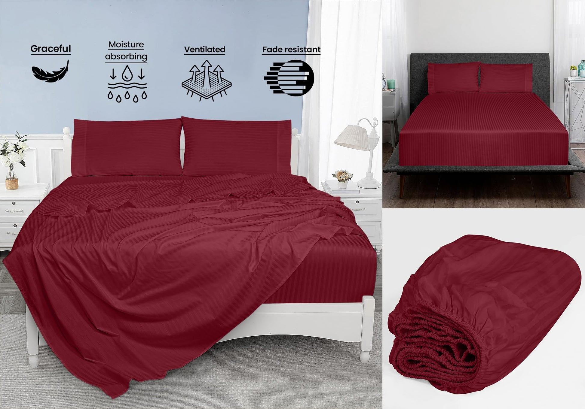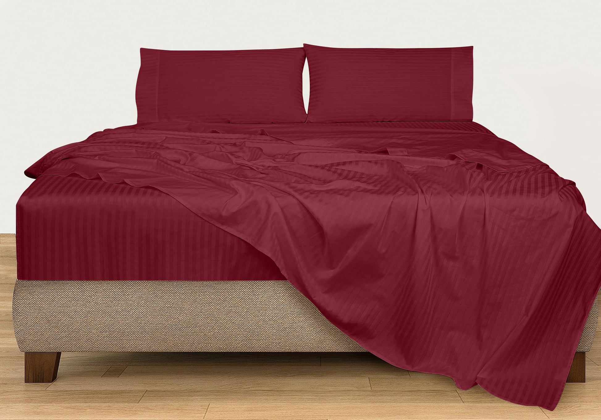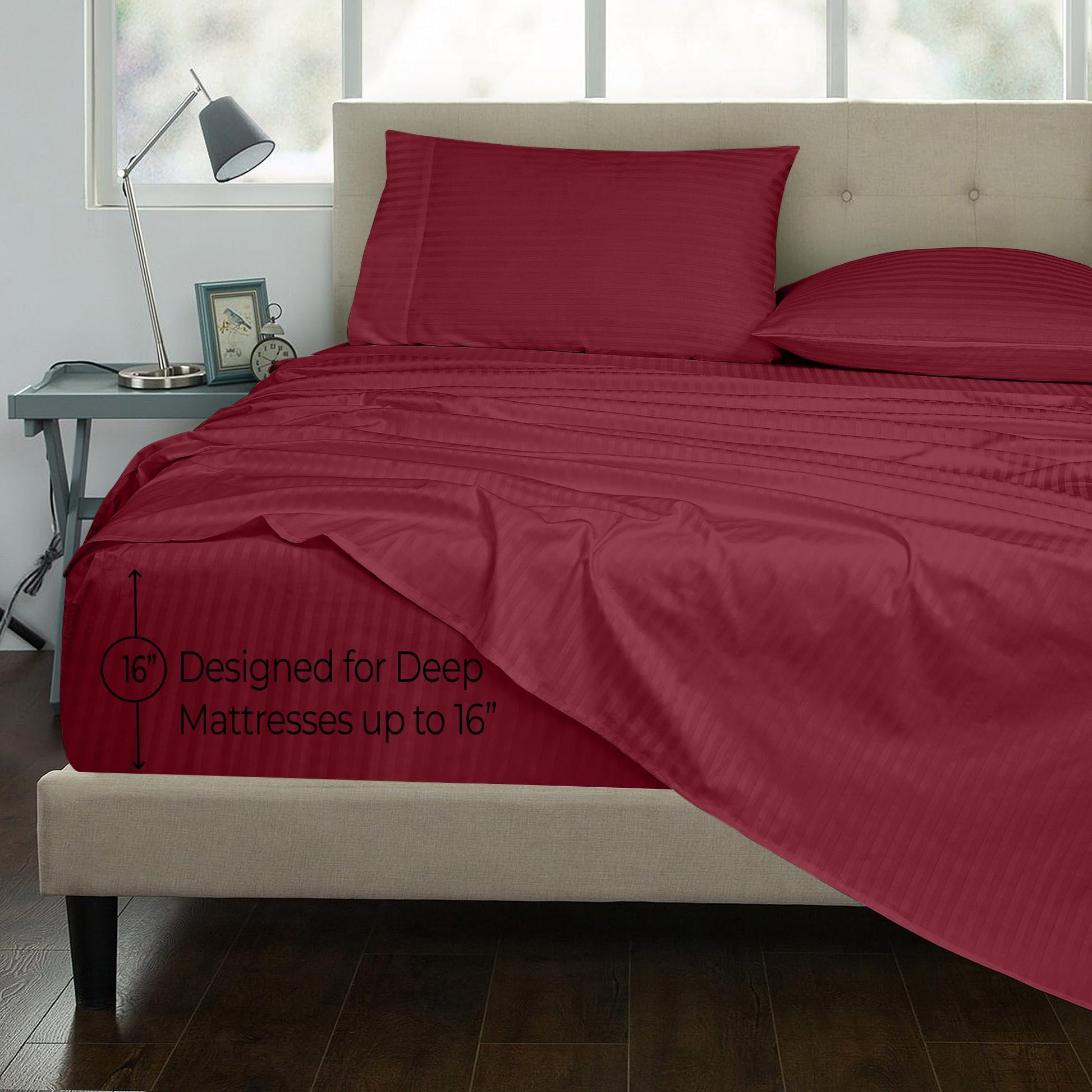 ROYALE LINENS 300 Thread Count 100% Long Staple Combed Cotton Printed Sheet Set - 4 Piece Bed Sheet - 1 Fitted Sheet, 1 Flat Sheet, 2 Pillow case -Cool & Crisp Sheet Set (Stripe Burgundy)