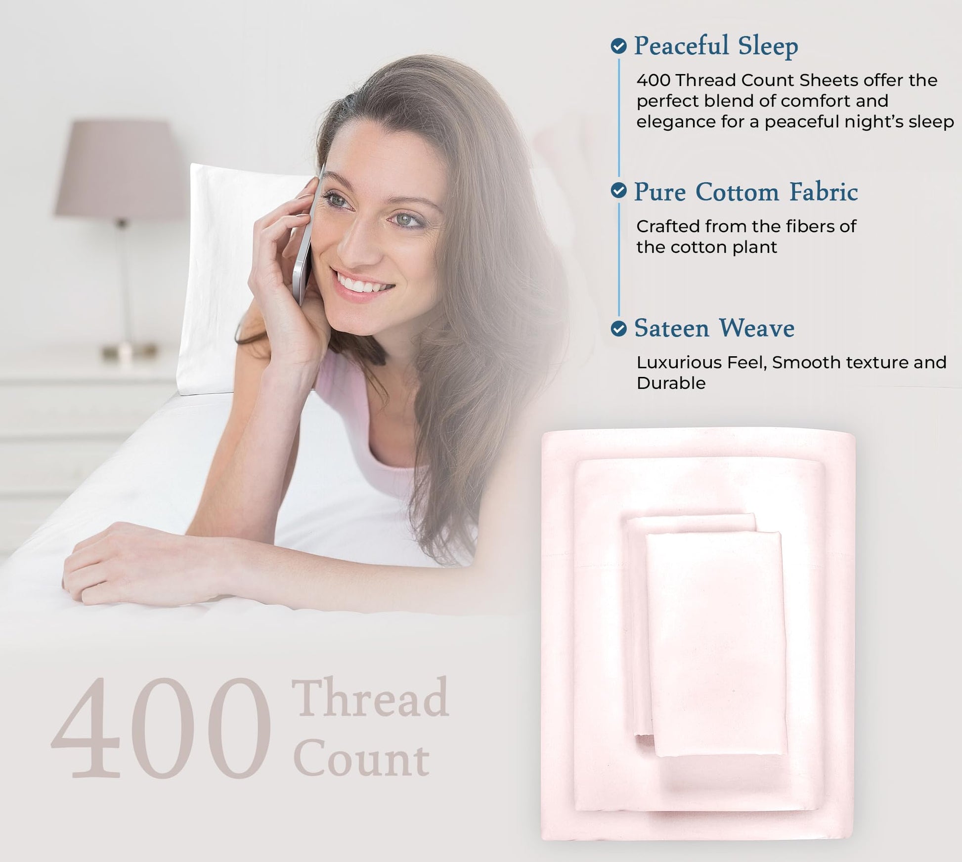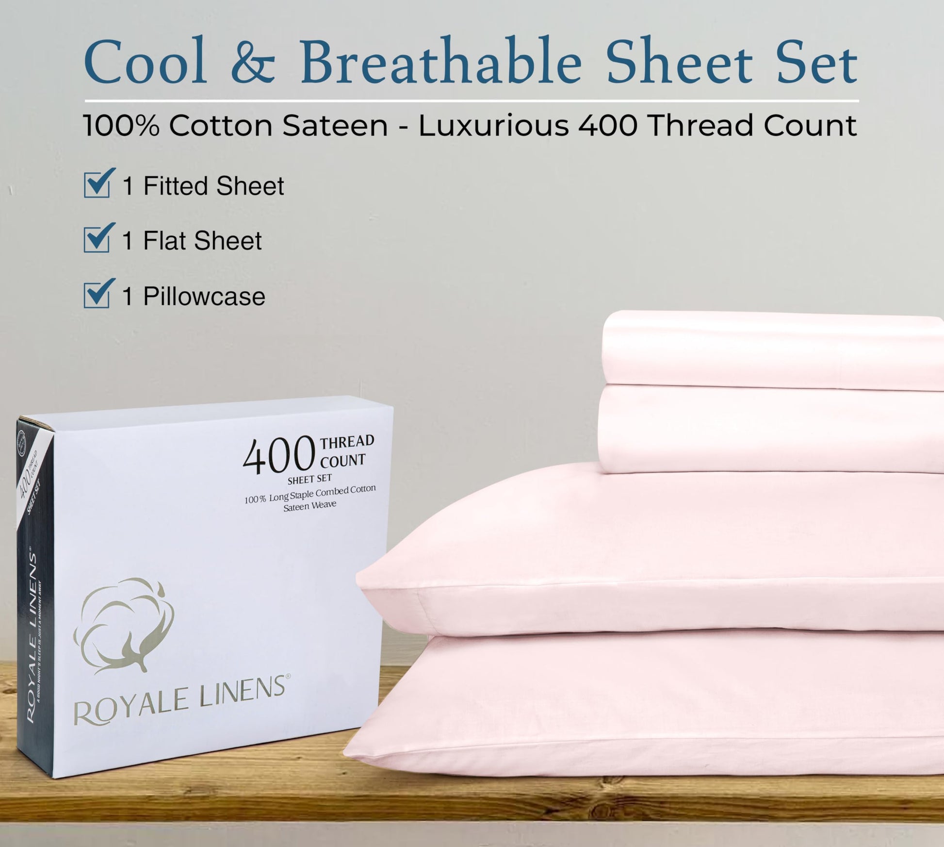 """A Good Night Sleep Is Just A Moment Away"" Royale Linens 400 Thread Count Sateen Bed Sheet Sets Are Manufactured Using Finest Quality 100% American Grown Cotton. Making Them Breathable, Comfortable And Cozy. Royale Linen Sheet Set Comes In 4 Different Sizes Twin Full Queen King Queen Sheet Set Include: 1 Flat Sheet 90X102 Inches, 1 Fitted Sheet 60x80 Inches With 14 Inch Drop 2 Pillow Case 20X30 Inches With 4 Inch Hem And Envelop Closure. Royale Linens Queen Size Sateen Bed Sheets Are Breathable, Cool And Super Silky Soft. Fabric Is Processed To Make It Shrink And Fade Resistant. Perfect For Bedroom, Guest Room, Kids Room, Hotels. Great Gift Idea For Men And Women On Valentine's Day - Mother's Day- Father's Day And Christmas. Our 400 Thread Count Bed Sheet Sets Are Certified Standard 100 By Oeko?Tex. According To The Guidelines, These Products Are Tested For Harmful Substances And Produced In An Environment Friendly And Socially Responsible Manner. Also Sustainable In Accordance With Oeko-tex Guidelines. Care Instruction: Machine Wash Or Hand Wash Using Cold Water Along With A Mild Detergent Is Recommended For Extending The Life Of The Set Along With Retaining Its Comfortability. Washing At High Temperatures Causes Microfiber To Expand Which Results In The Trapped Dirt And Other Tiny Particles Being Released. If You Want To Hand Wash The Set, Then Consider Using A Soft-haired Brush To Rinse Thoroughly."