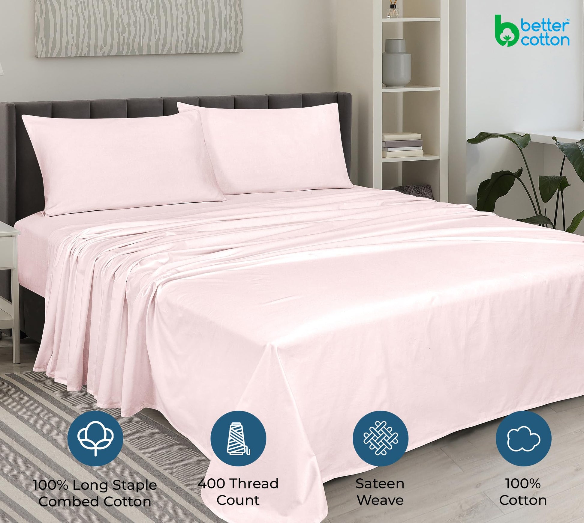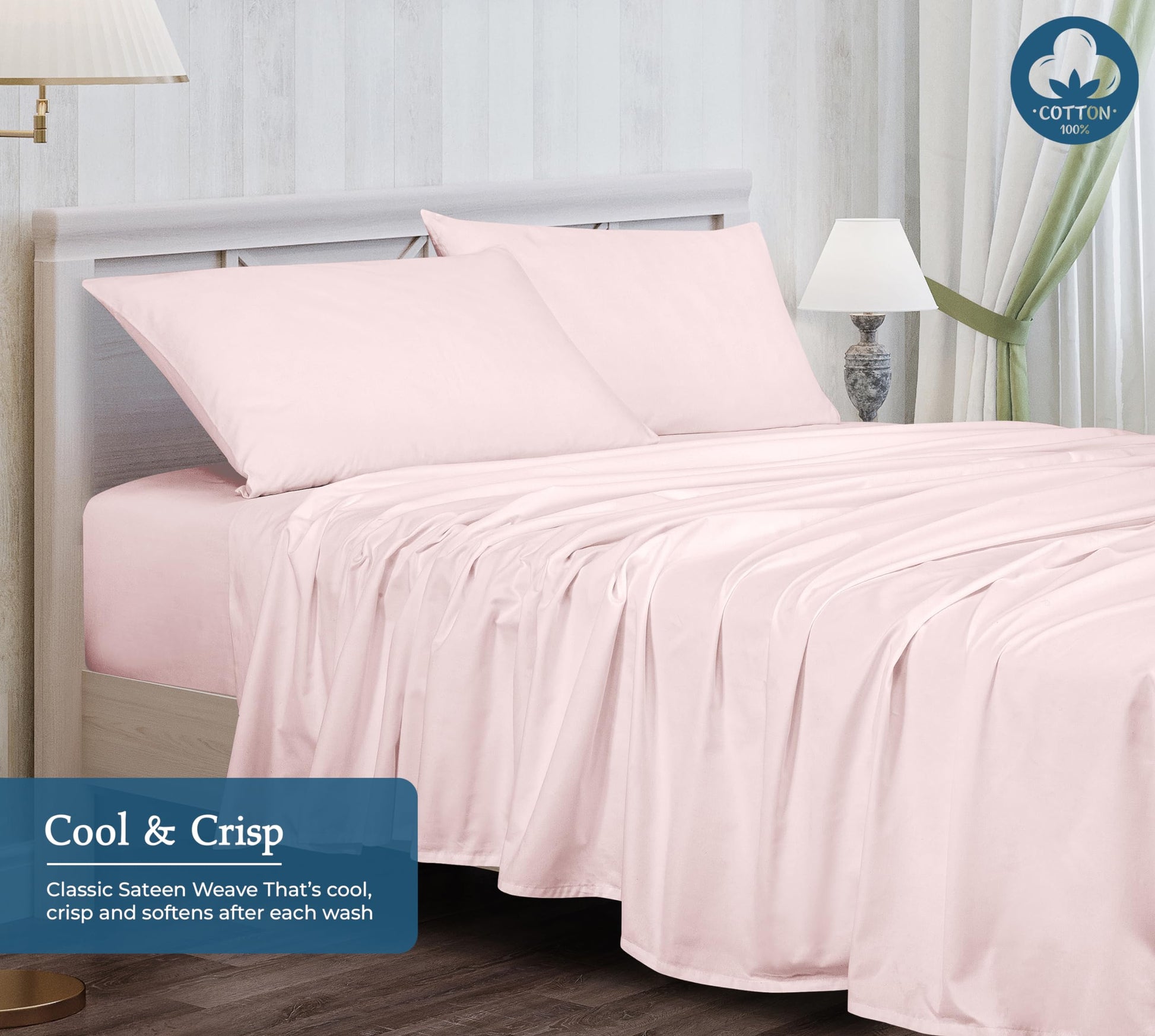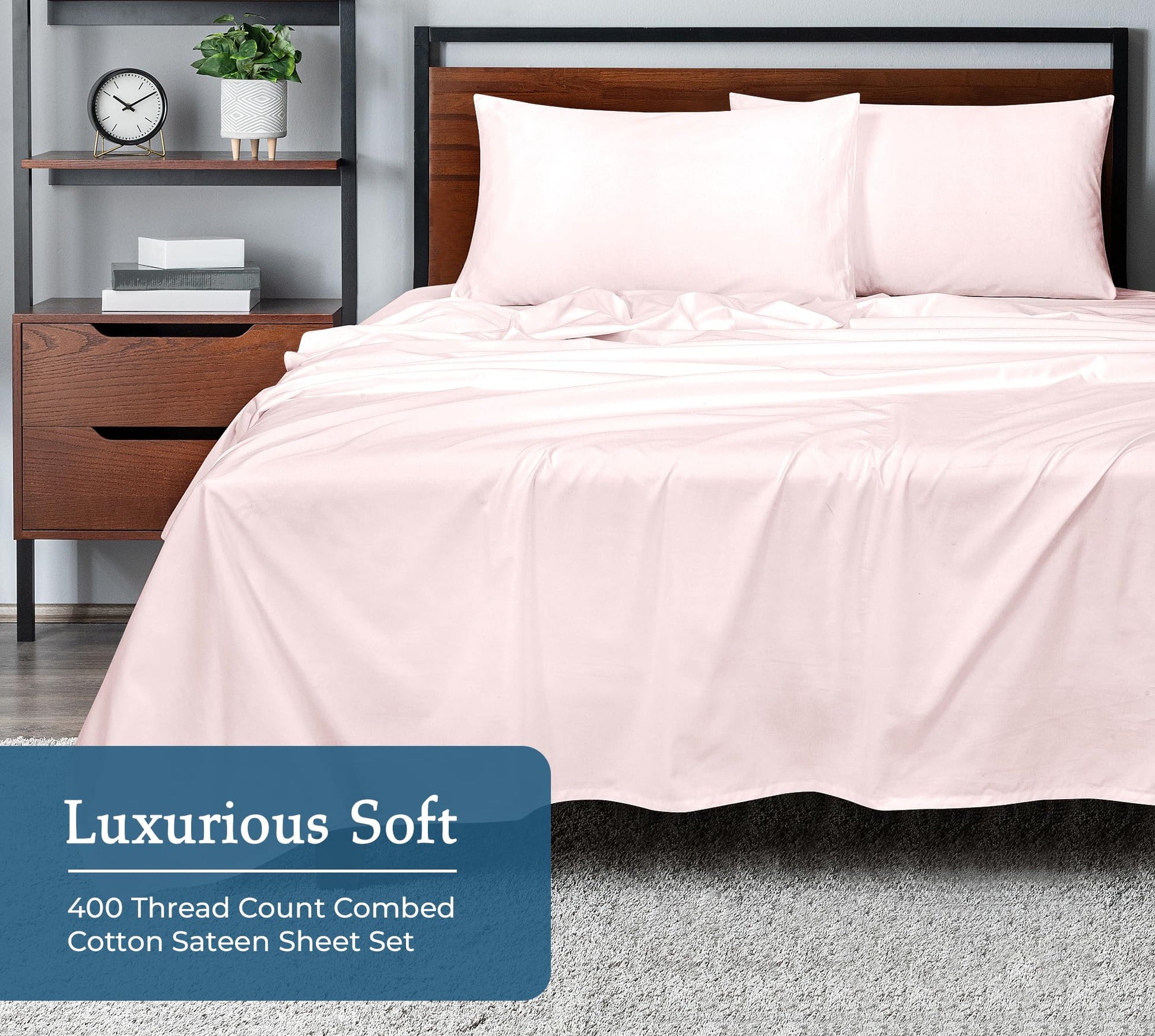 ROYALE LINENS 400 Thread Count 100% American Grown Cotton 4 Piece Sateen Sheet Set - 1 Fitted Sheet, 1 Flat Sheet, 2 Pillow case - Pink Bedsheet - Cotton Sheets - (Kyoto Blush)