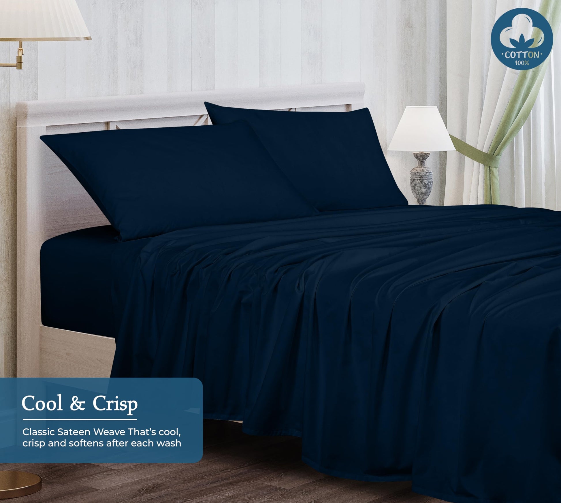 ROYALE LINENS 400 Thread Count 100% American Grown Cotton 4 Piece Sateen Sheet Set - 1 Fitted Sheet, 1 Flat Sheet, 2 Pillow case - Navy Bedsheet - Cotton Sheets - (Rivera Navy)