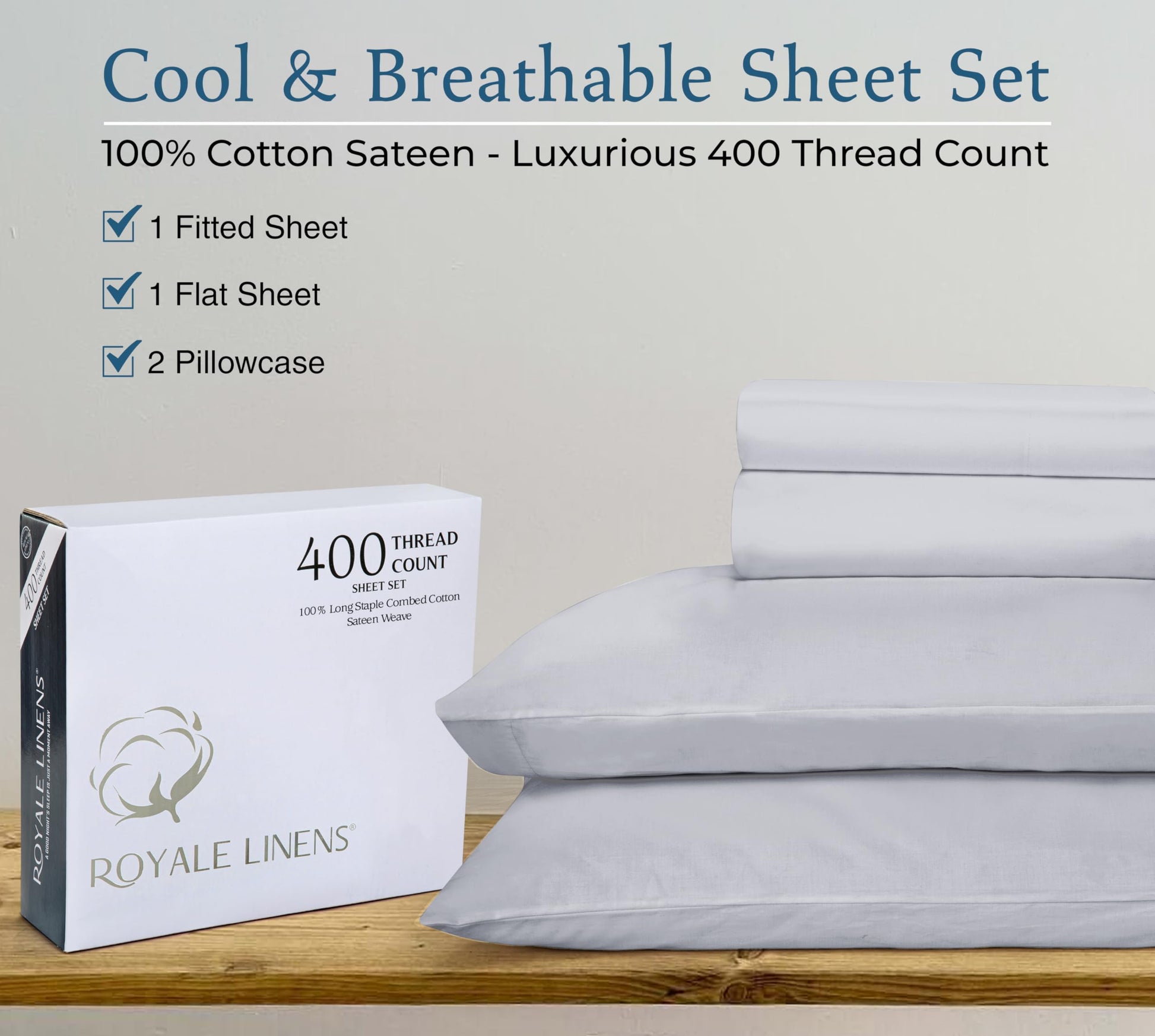 """A Good Night Sleep Is Just A Moment Away"" Royale Linens 400 Thread Count Sateen Bed Sheet Sets Are Manufactured Using Finest Quality 100% American Grown Cotton. Making Them Breathable, Comfortable And Cozy. Royale Linen Sheet Set Comes In 4 Different Sizes Twin Full Queen King Queen Sheet Set Include: 1 Flat Sheet 90X102 Inches, 1 Fitted Sheet 60x80 Inches With 14 Inch Drop 2 Pillow Case 20X30 Inches With 4 Inch Hem And Envelop Closure. Royale Linens Queen Size Sateen Bed Sheets Are Breathable, Cool And Super Silky Soft. Fabric Is Processed To Make It Shrink And Fade Resistant. Perfect For Bedroom, Guest Room, Kids Room, Hotels. Great Gift Idea For Men And Women On Valentine's Day - Mother's Day- Father's Day And Christmas. Our 400 Thread Count Bed Sheet Sets Are Certified Standard 100 By Oeko?Tex. According To The Guidelines, These Products Are Tested For Harmful Substances And Produced In An Environment Friendly And Socially Responsible Manner. Also Sustainable In Accordance With Oeko-tex Guidelines. Care Instruction: Machine Wash Or Hand Wash Using Cold Water Along With A Mild Detergent Is Recommended For Extending The Life Of The Set Along With Retaining Its Comfortability. Washing At High Temperatures Causes Microfiber To Expand Which Results In The Trapped Dirt And Other Tiny Particles Being Released. If You Want To Hand Wash The Set, Then Consider Using A Soft-haired Brush To Rinse Thoroughly."