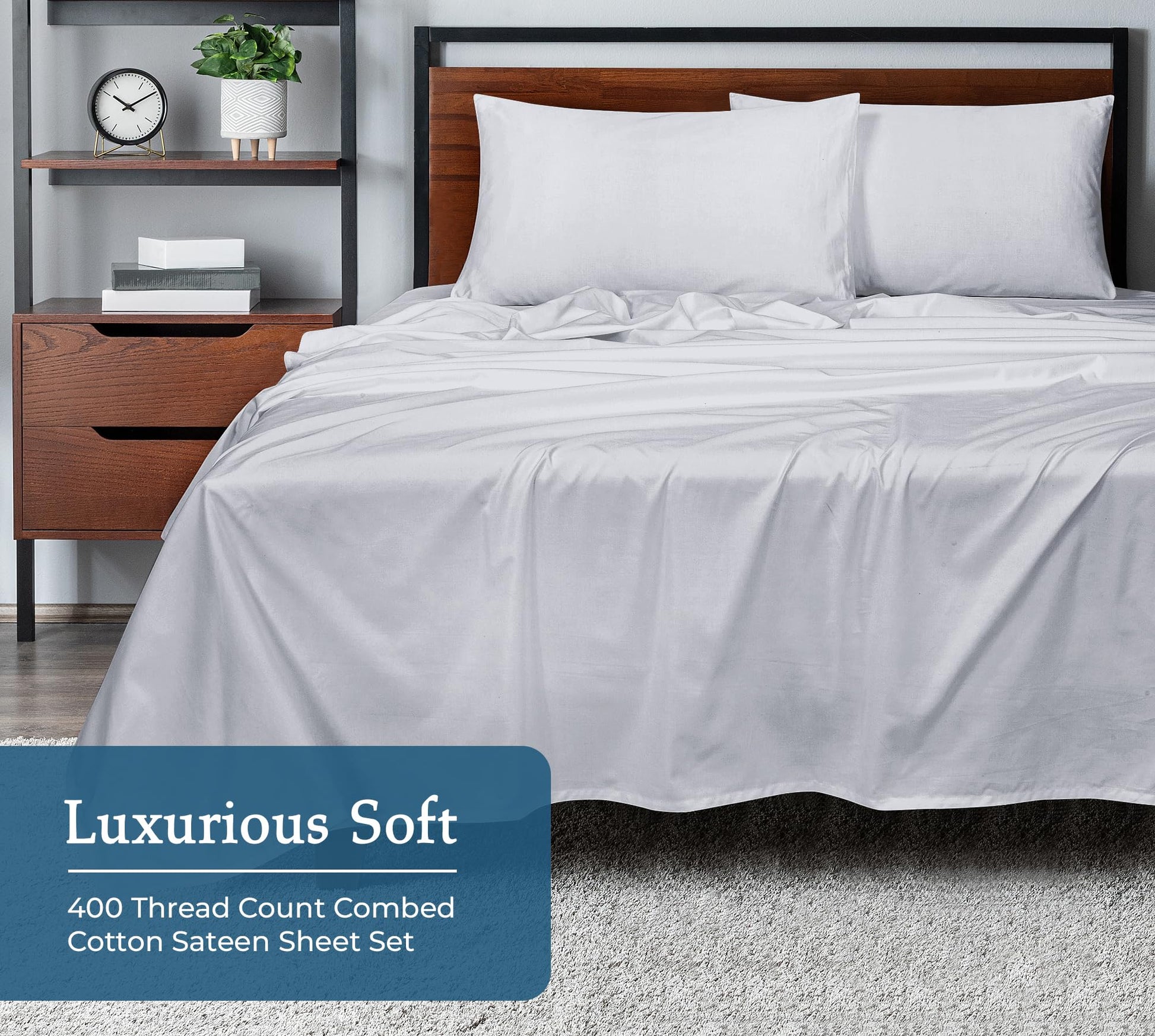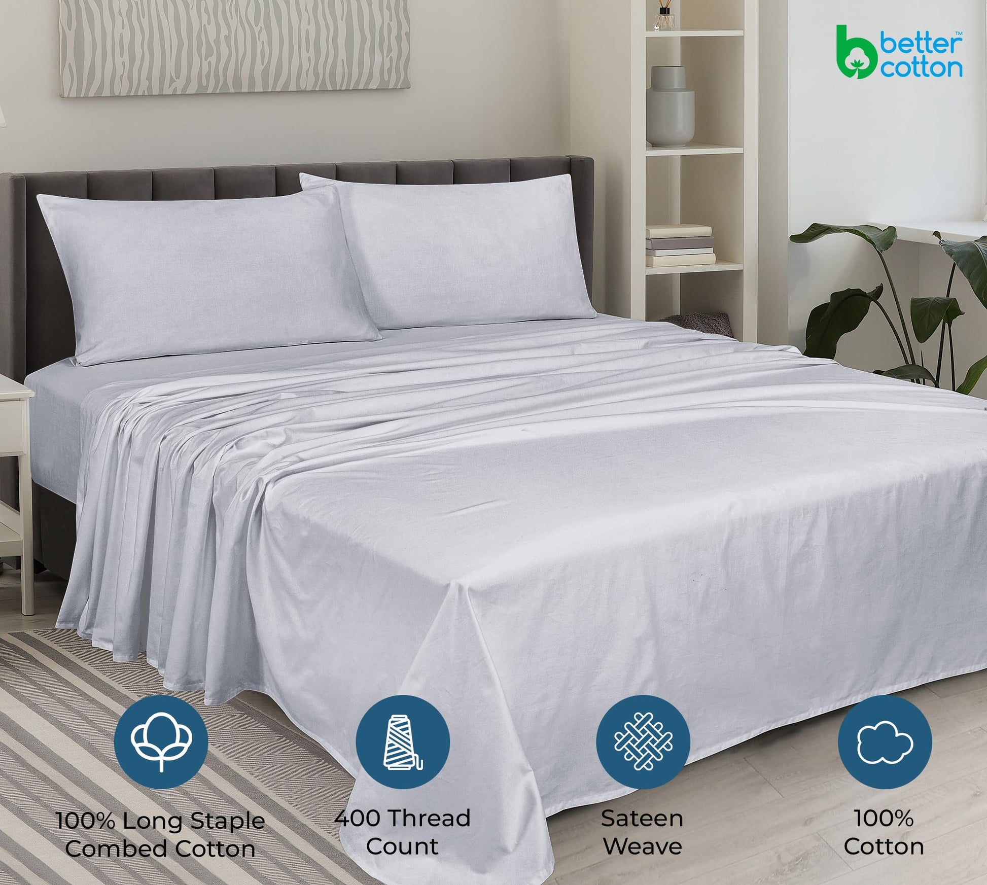 ROYALE LINENS 400 Thread Count 100% American Grown Cotton 4 Piece Sateen Sheet Set - 1 Fitted Sheet, 1 Flat Sheet, 2 Pillow case - Silver Bedsheet - Cotton Sheets - ( Spanish Silver)