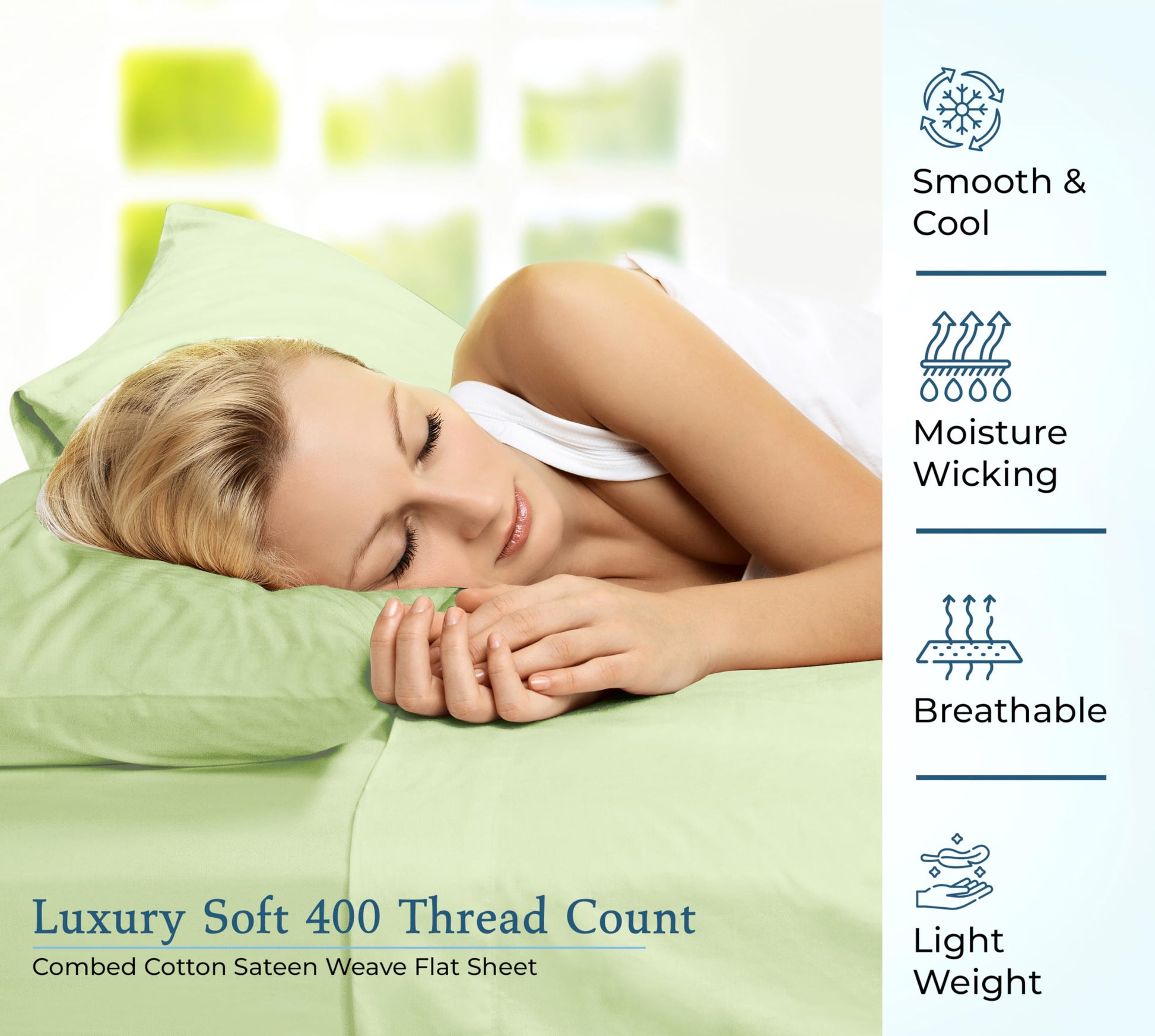 400 Thread Count 100% American Grown Cotton Flat Sheet - Cooling Sheets - Sheets - Luxury Sateen Weave - Flat Sheet Sold Separately - Soft Green Flat Sheet Only ( Florentine Sage)