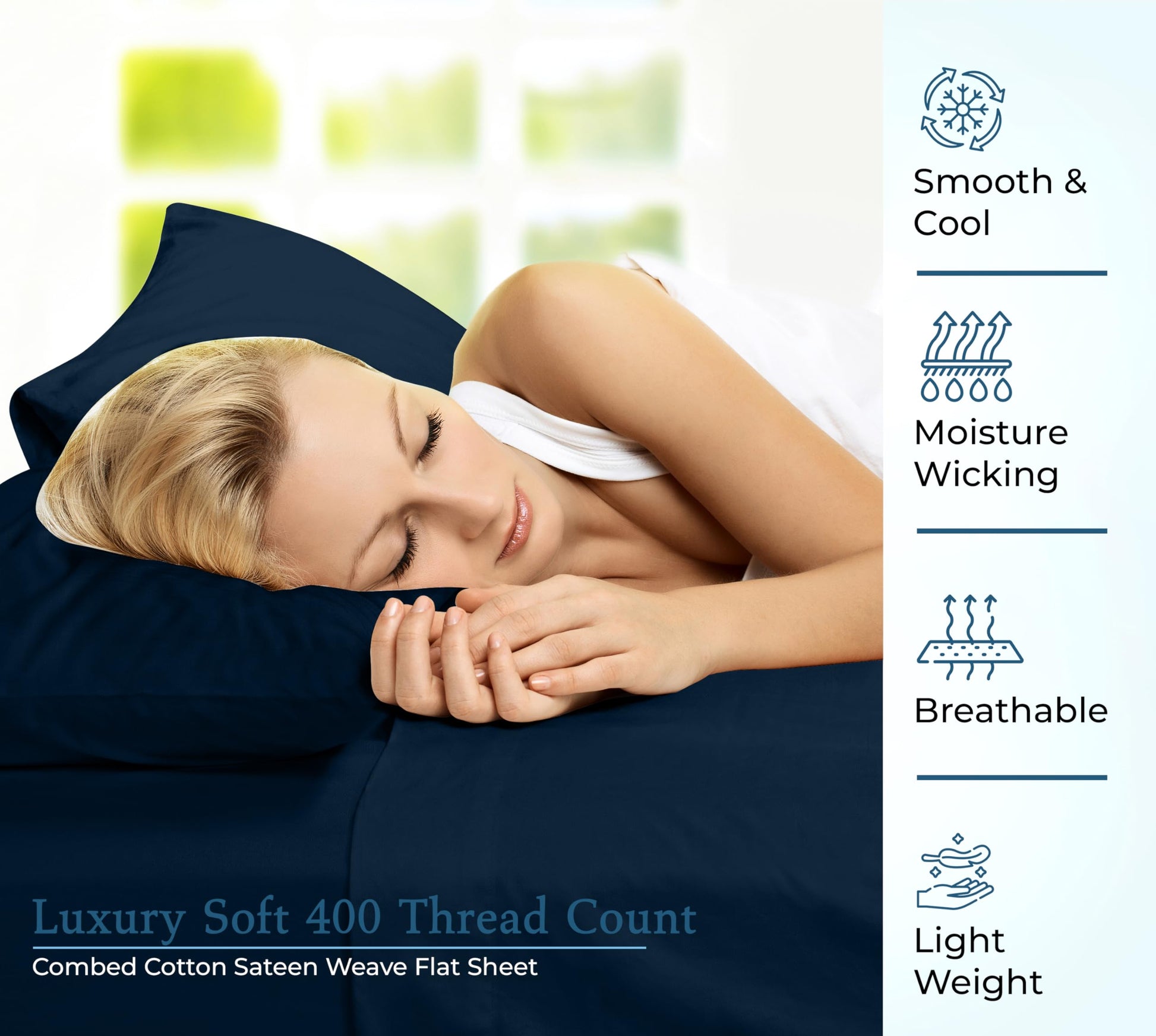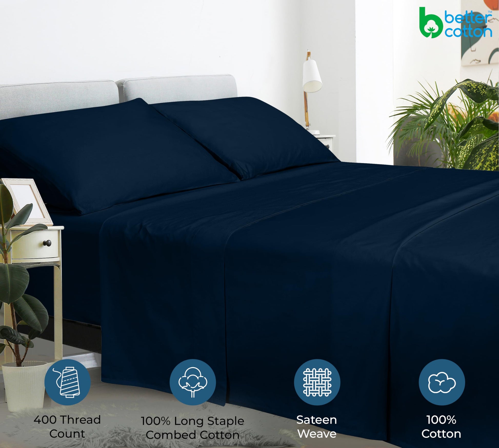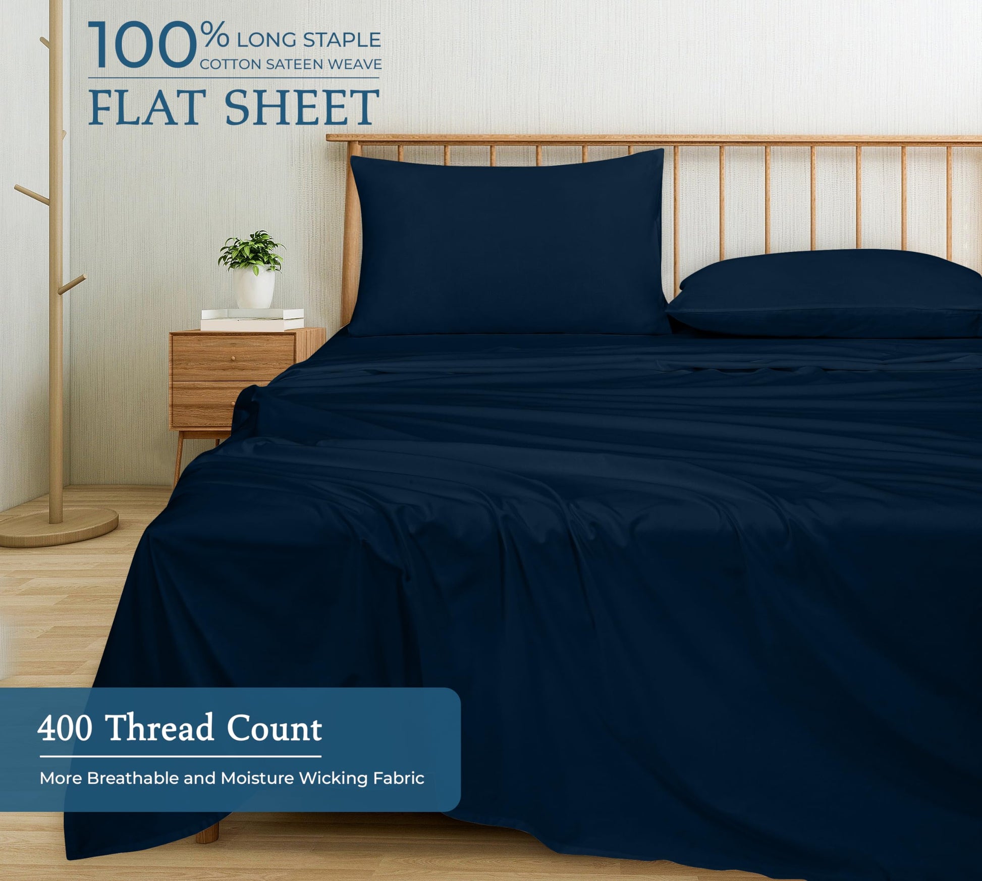 400 Thread Count 100% American Grown Cotton Flat Sheet - Cooling Sheets - Sheets - Luxury Sateen Weave - Flat Sheet Sold Separately - Navy Flat Sheet Only ( Rivera Navy)